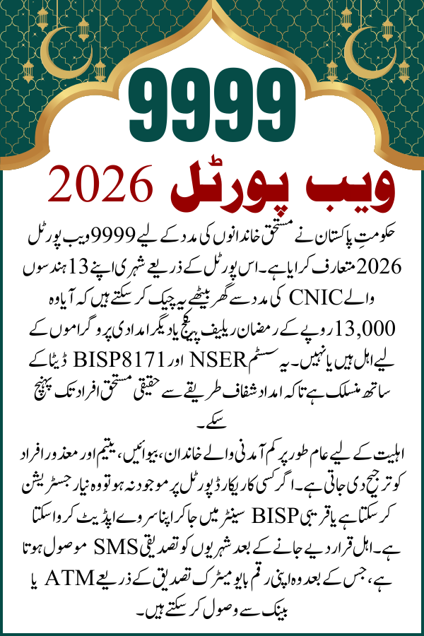 The 9999 Web Portal 2026 is a vital tool for the people of Pakistan to access their rightful financial aid with transparency. By utilizing the 9999 check online CNIC 2026 system, you can stay updated on the 13,000 Ramzan package and other emergency relief funds. Always use official links and never pay any agent to process your application, as government services are strictly free of cost.